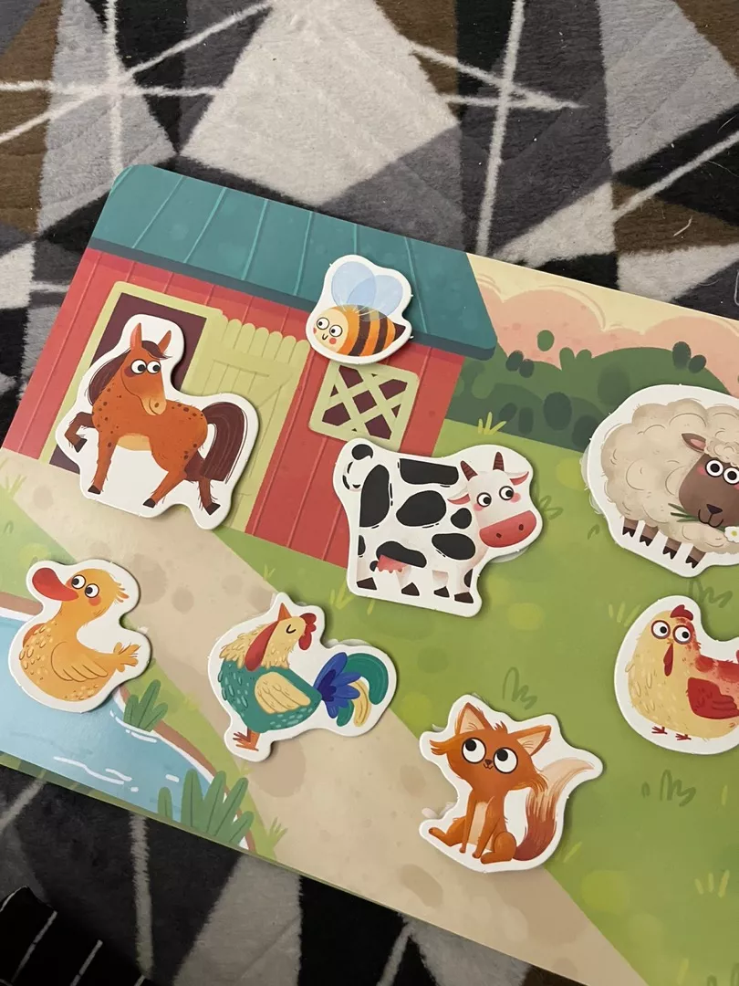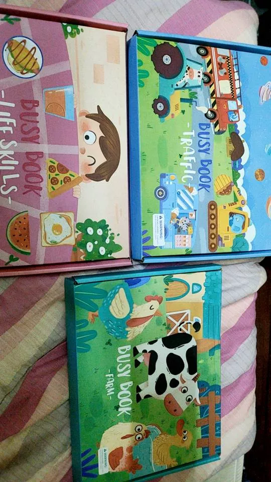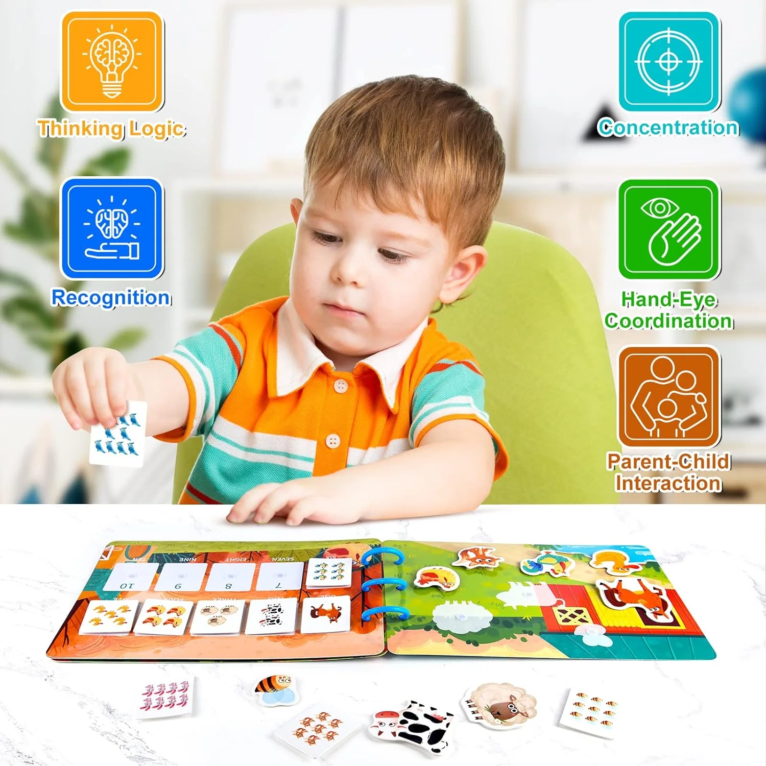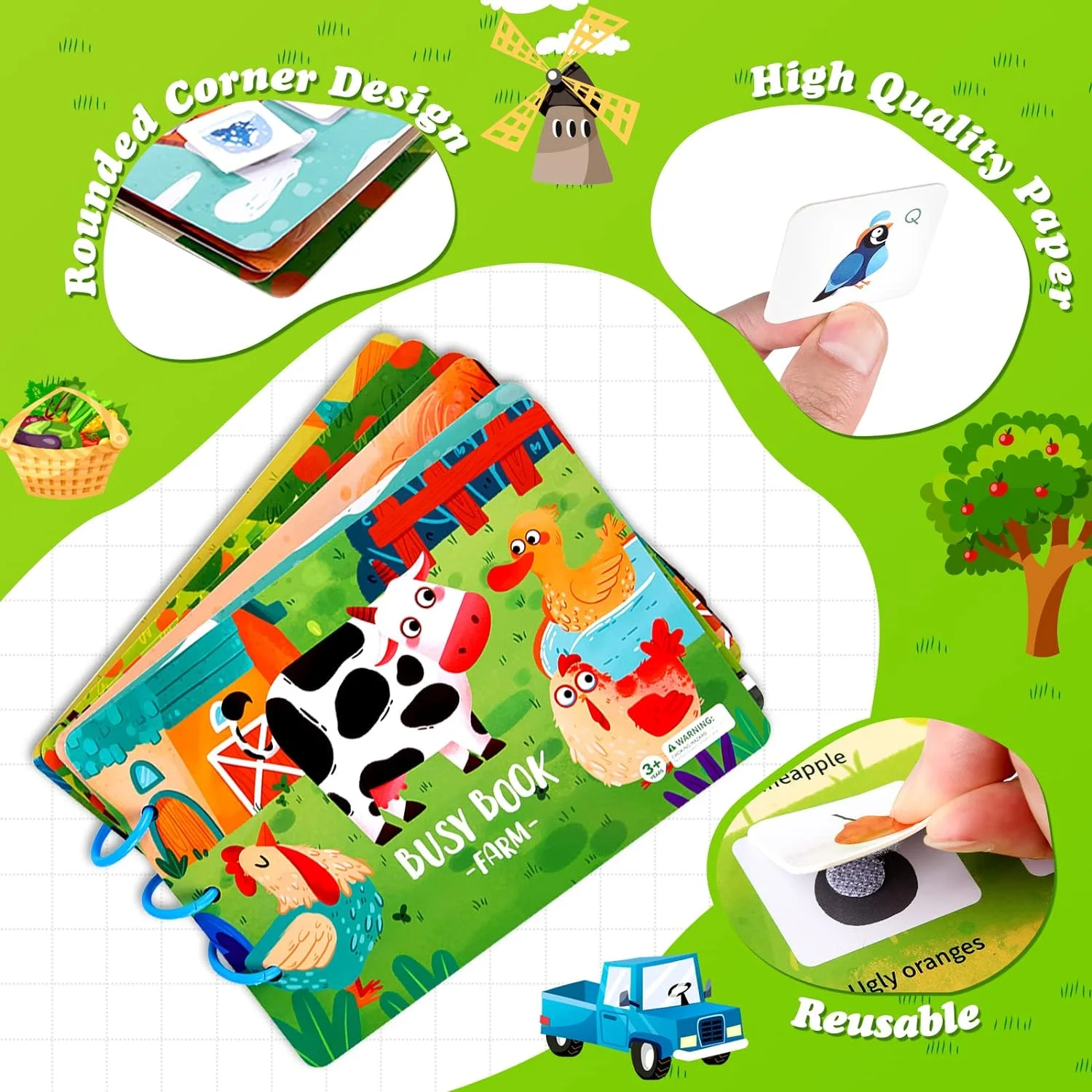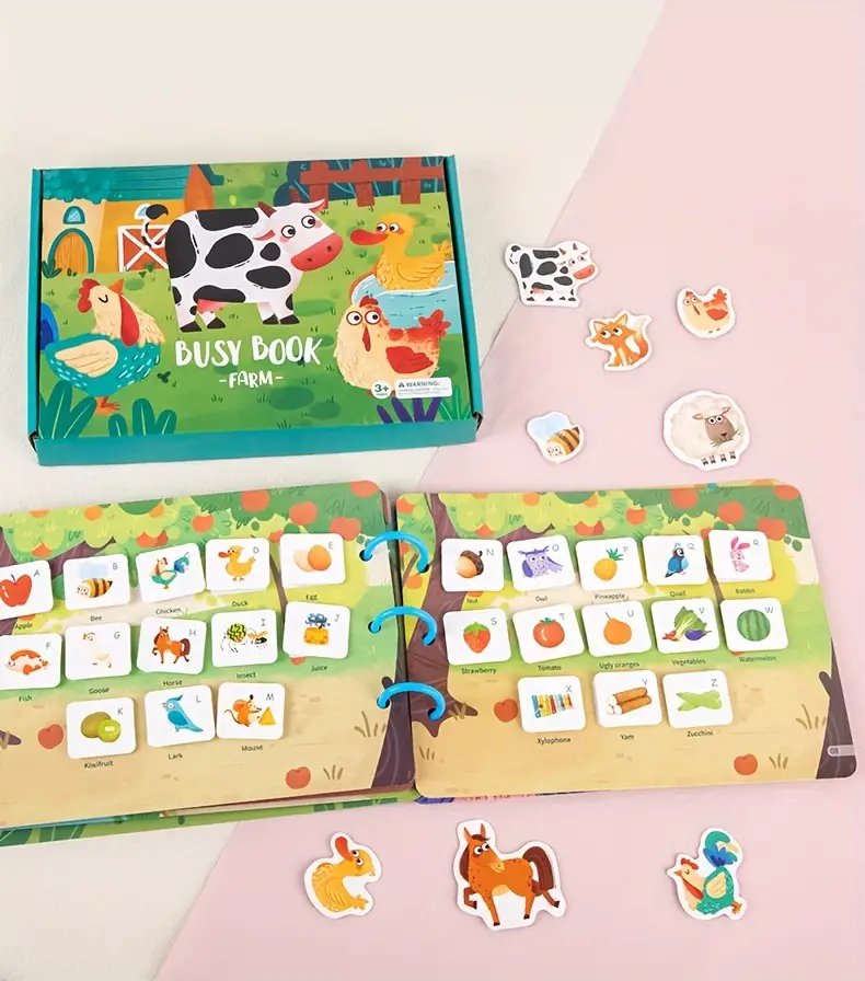 ce livre occupé sur le thème de la ferme dispose de 10 thèmes différents, y compris la reconnaissance des animaux, la météo, les couleurs, les fruits, l'alphabet, le mot, le chiffre, le comptage, le puzzle, etc. Remarque : le thème des couleurs et le thème des fruits partagent les mêmes cartes de réponse (ces cartes s'appliquent aux deux thèmes, ce produit est complet sans cartes manquantes)